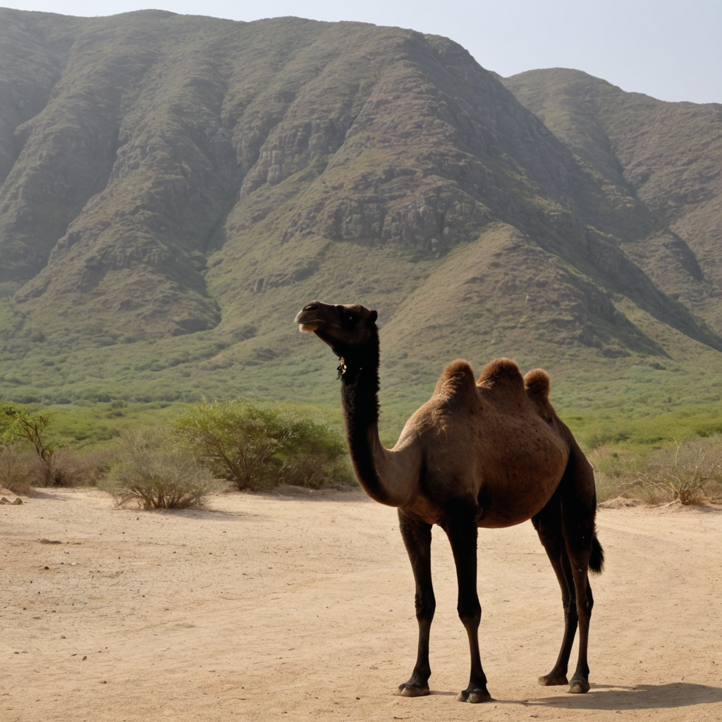 ناقه سوداء واقفه في صلاله ورافعه يدها