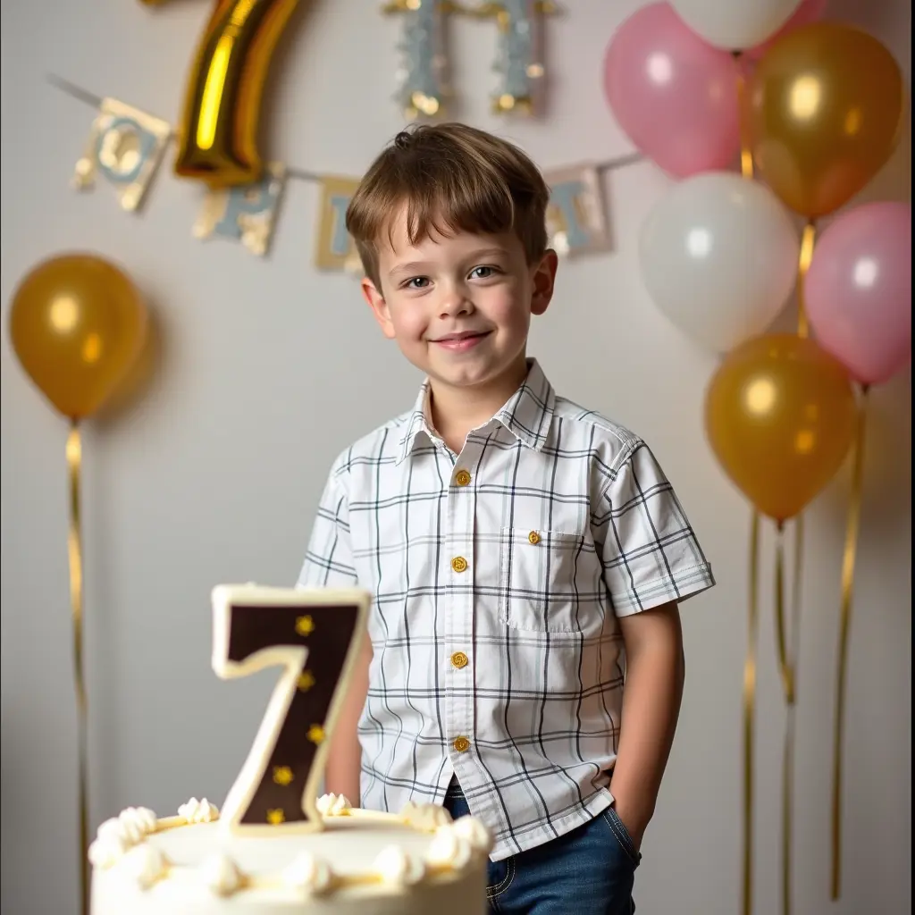 A boy celebrating his 7th birthday wearing a white checkered shirt and blue jeans shorts. In front of him is a birthday cake with the number 7 on it. Behind him is a number 7 balloon, decorations and lots of balloons. The boy is looking at the camera.