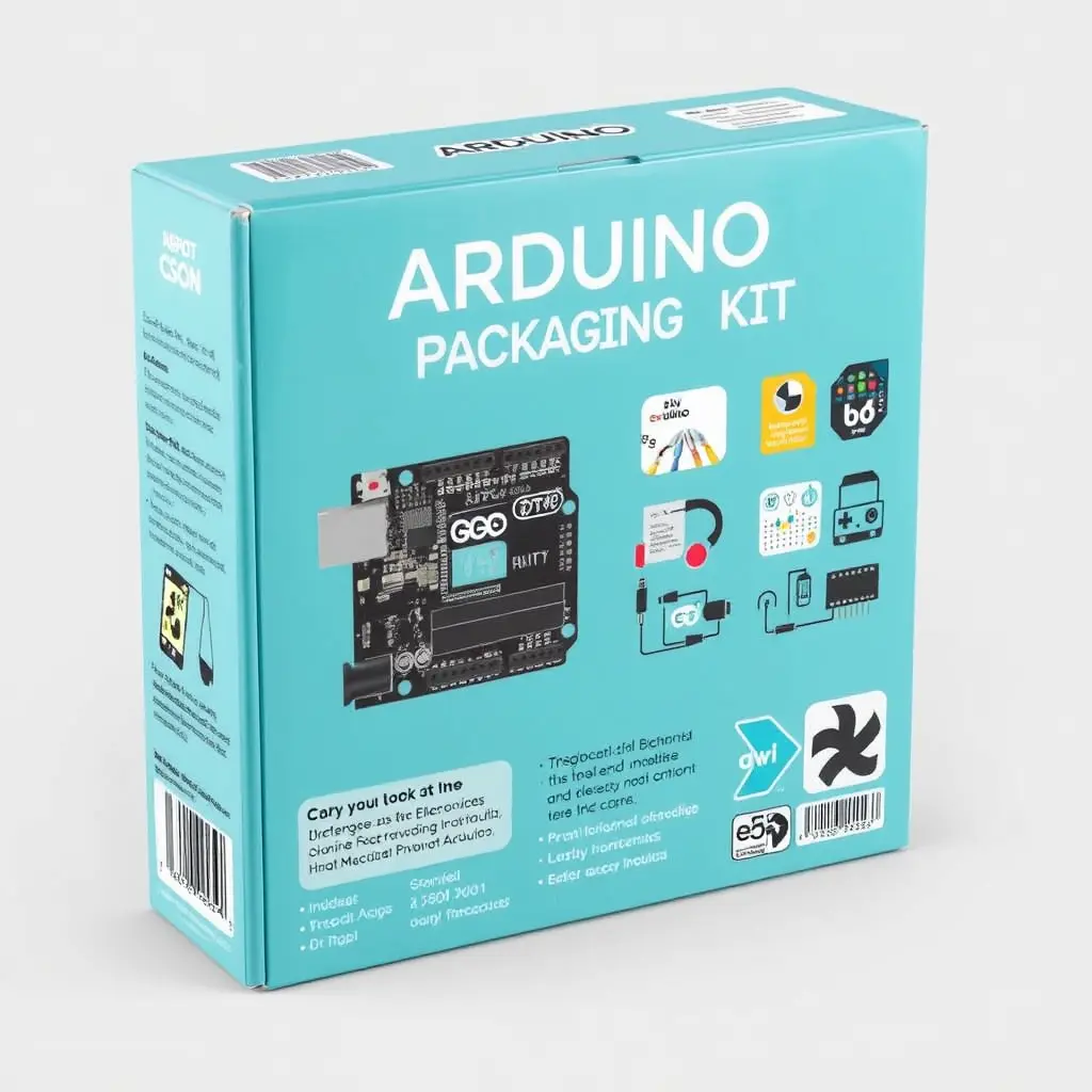 Packaging Kit Arduino Contexte : Créer un packaging attrayant et fonctionnel pour un kit Arduino destiné aux débutants et aux passionnés d'électronique. Objectifs : Attrait visuel : Le design doit être moderne et dynamique pour attirer l'attention des utilisateurs dans les magasins. Fonctionnalité : Le packaging doit être facile à ouvrir et à refermer, tout en protégeant les composants à l'intérieur. Information : Inclure des informations claires sur le contenu du kit, les projets possibles et des ressources d'apprentissage. Éléments à inclure :