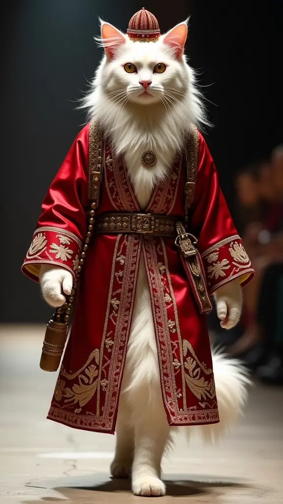 Ultra realistic full body photo of a stylish beautiful short fluffy white male cat walking the runway modeling traditional old syrian clothes and a fez with details and contrasting colors vivid intricate bold vibrant glamorous ultimate elegance beautiful luxurious awesome wealthy opulent exquisite resplendent magnificent sublime 12k
