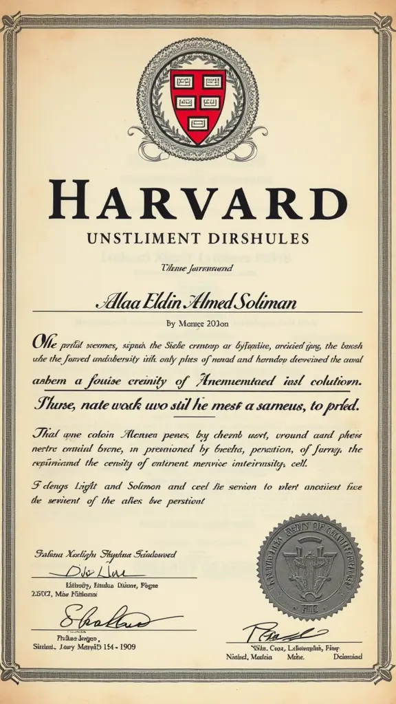 PHD certificate from harvard universityImage promptCopyPHD certificate from harvard university with name DR/Alaa Eldin Ahmed Soliman and has american stamp Aspect ratioPortrait Model used Flux Dev Width576 Height1024 Created at26/10/2024 App used Image Generator Download full resolutionEdit imageGenerate similar image0