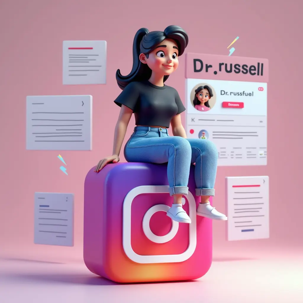 A 3D animated female character sitting on a large pink block with the Instagram logo. He wears blue jeans and a black T-shirt. He is 15 years old. The background features a digital representation of an Instagram profile page with the name 'Dr.russell' and a small circular profile picture empty. The overall theme seems to be a fusion of digital and animated elements, possibly depicting a virtual or digital avatar on Instagram.