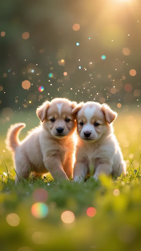 Rainbow Raindrop Meadow: Adorable puppies with soft rainbow hues playing in a field as tiny, colorful raindrops fall around them, glistening in the sunlight. The raindrops cast tiny rainbows on the puppies’ fur, enhancing the scene with extra sparkle.