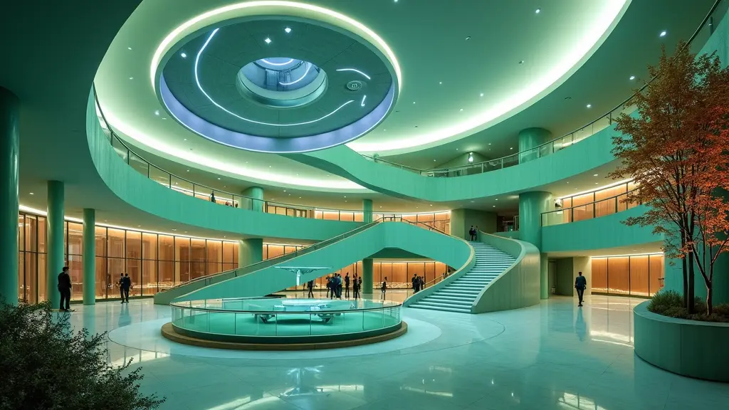 طراحی اداره پلیس ، سبک مدرن و کلاسیک ، رنگ سبز و سفید ، میز شیشه ای ، طبقات و طاقچه های زیاد منحنی ، نور پردازی سفید و آبی ، سقف لاین نوری طراحی سقف با کناف و منحنی ، طاق نما ، پله ها گرد و منحنی به بالا ، شب ، فرم خاص و منحنی ، انسان هایی ایستاده باشند ، پنجره های سرتاسر بزرگ ، فصل پاییز