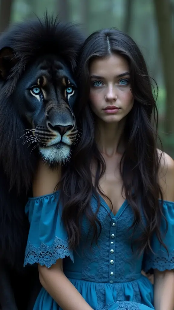 The image is a portrait of a young woman with long dark hair and blue eyes. She is wearing a blue dress with intricate lace detailing and her hair is styled in loose waves. The woman is sitting next to a large black lion with blue eyes, which is resting its head on the woman’s shoulder. The lion’s face is turned to the side, and its eyes are looking directly at the camera. The background is blurred, but appears to be a wooded area with trees and foliage. The overall mood of the image is dark and mysterious.