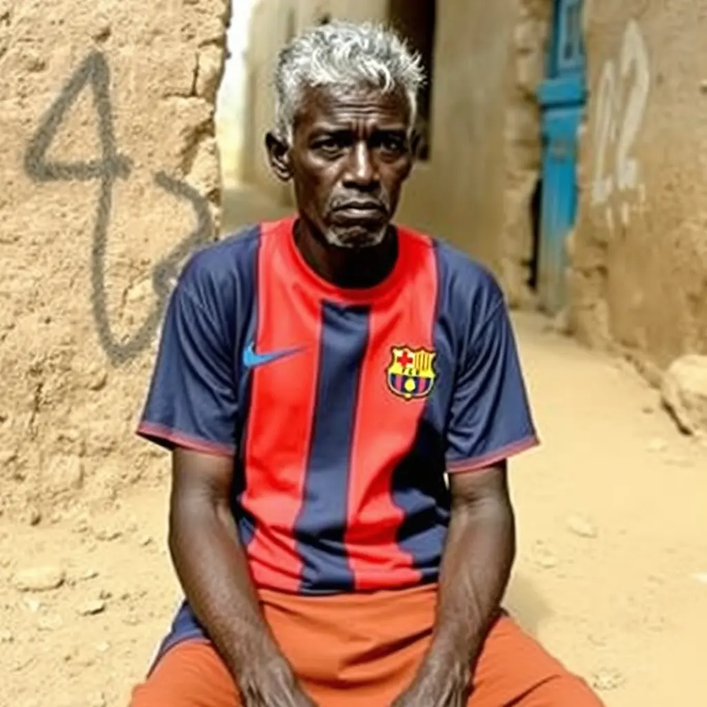 A black-skinned, gray-haired man sittingImage promptCopyA black-skinned, gray-haired man sitting in the muddy streets of Hadramaut, wearing a Barcelona T-shirt Written on the wall name is "Salem Ashoor" is very sad "4-2" Aspect ratioSquare Model used Flux Fast Width1024 Height1024 Created at29/09/2024 App used Image Generator Download full resolutionEdit imageGenerate similar image0