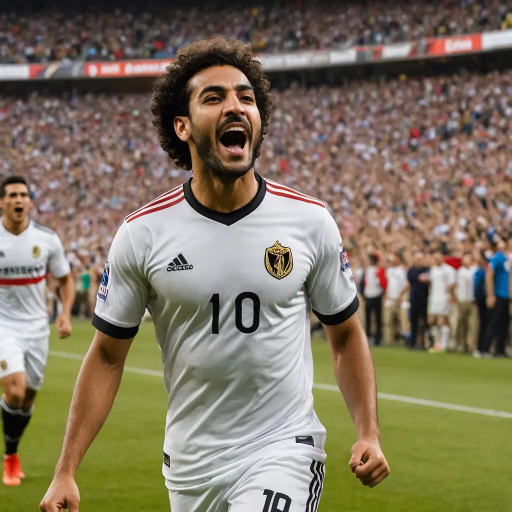 Imagine an Egyptian football player in America, wearing a jersey with the name "Mo Salem" on the back. The player looks energetic and enthusiastic as a crowd watches him closely. The background reflects the excitement of a match, with stands filled with fans. The image focuses on the movement and energy surrounding the game.