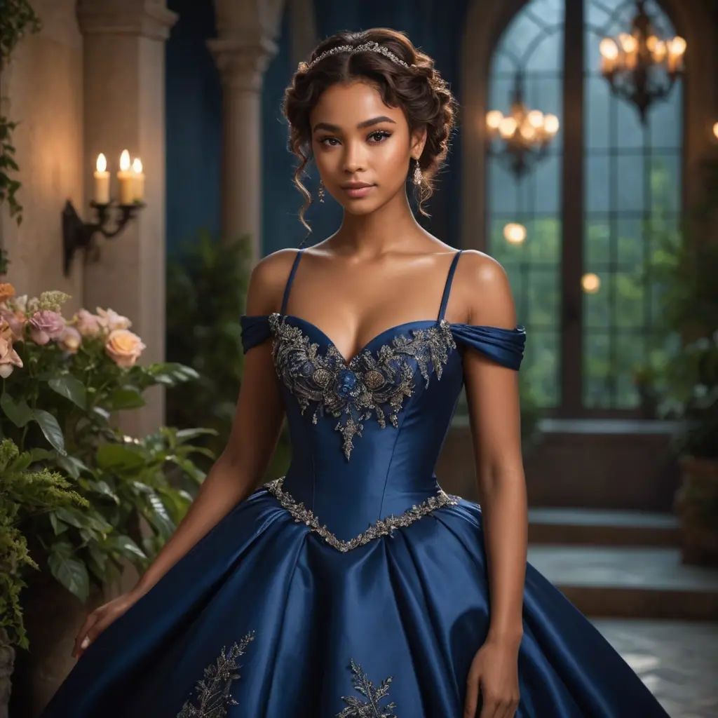 A young woman 25 year old with brown skin and tawny hair styled in a simple updo with loose soft curls around her face. Her dark eyes are filled with a quiet confidence and intelligence. She wears a stunning embellished gown of sapphire hue, reminiscent of a French-inspired fantasy, with a corseted bodice that accentuates her figure. The setting is a twilight garden, the soft light casting a glow on her radiant features and the vibrant gown. Character design wlop style.