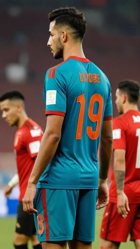 A football player in theImage promptCopyA football player in the Moroccan national team has the name L.Ayoube written on his back in the form of an anime Aspect ratioPortrait Model used SDXL Width576 Height1024 Created at11/10/2024 App used Image Generator Download full resolutionEdit imageGenerate similar image0