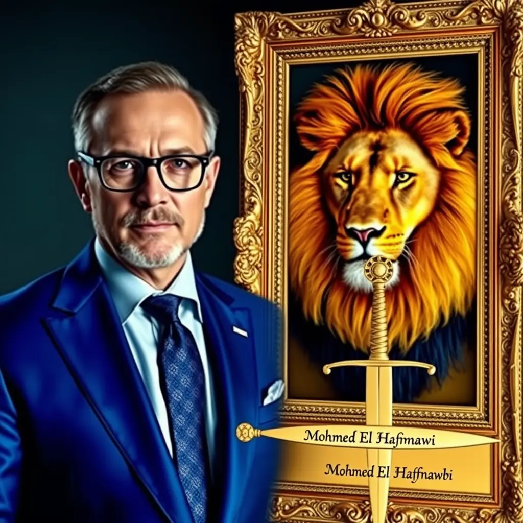 صوره رجل انيق ليس بكثيف الشعر يرتدي نضاره و بدلة فخمة زرقاء اللون و جنبه اسد حقيقي داخل إطار ذهبي مزخرف و تحته إطار ذهبي منقوش عليه سيف العدالة فالزخرفة من طرفين و يكتب عالسيف اسم Mohamed EL Hafnawi