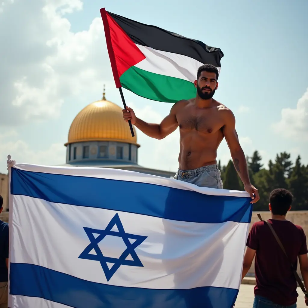 A tall, strong man, withImage promptCopyA tall, strong man, with a black man next to him on the right, steps on the Israeli flag and carries the Palestinian flag over the Al-Aqsa Mosque in Gaza. Aspect ratioSquare Model used Flux Dev Width1024 Height1024 Created at22/09/2024 App used Image Generator Download full resolutionEdit imageGenerate similar image0