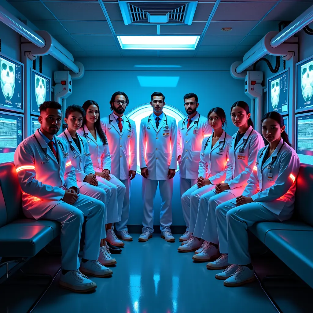 A cyberpunk-themed group photo of a radiology department team. The team consists of futuristic doctors, radiologic technologists, and nurses, all wearing high-tech medical suits with glowing neon accents. The background is a high-tech radiology room with advanced futuristic imaging equipment, like holographic displays, robotic arms, and neon lights. The atmosphere is dark and moody, with vibrant neon colors and digital screens displaying medical data.