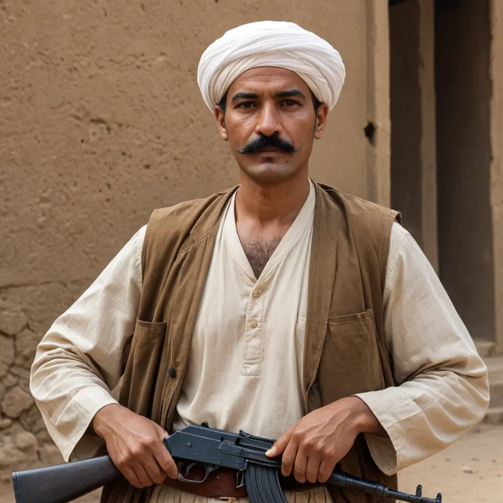 رجل صعيدي لونه حنطي فاتح بالأربعين من عمره وعيناها سوداء ولديه شنب كثيف وليس لديه لحيه ويرتدي عمامه بيضاء و يحمل رشاش AK47 ويشرب سجارة ويرتدي ثوب لونه بني ويرتدي درع