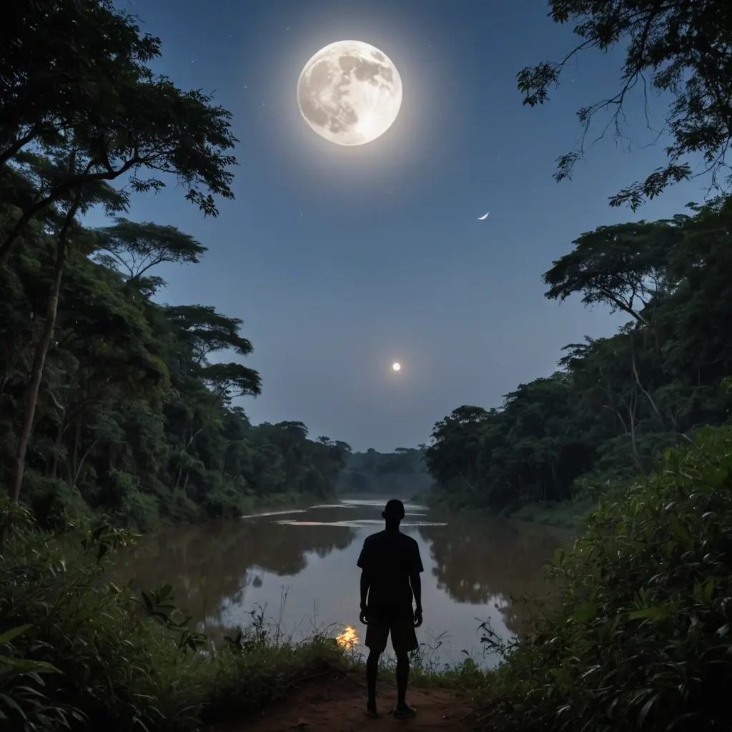 صورة لشخص ينظر للقمر وسط الغابات الافريقيه بالقرب من النهر