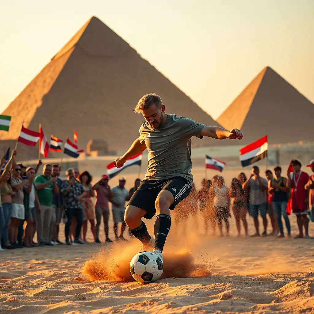 "هالاند يلعب كرة القدم باحترافية أمام الأهرامات المصرية في لقطة سينمائية مذهلة بدقة 4K، يُسدد الكرة بقوة على الرمال الذهبية، وخلفه الأهرامات العظيمة تحت ضوء الغروب الدافئ. حوله مجموعة من المشجعين المتحمسين من جنسيات مختلفة، يلوّحون بالأعلام ويهتفون له بحماس. الغبار يتطاير من حركة الكرة، وتعابير وجه هالاند حماسية ومليئة بالتركيز. تصوير سينمائي واقعي بعدسة واسعة، مع تأثيرات ضوئية درامية تُبرز روعة المكان والحدث."