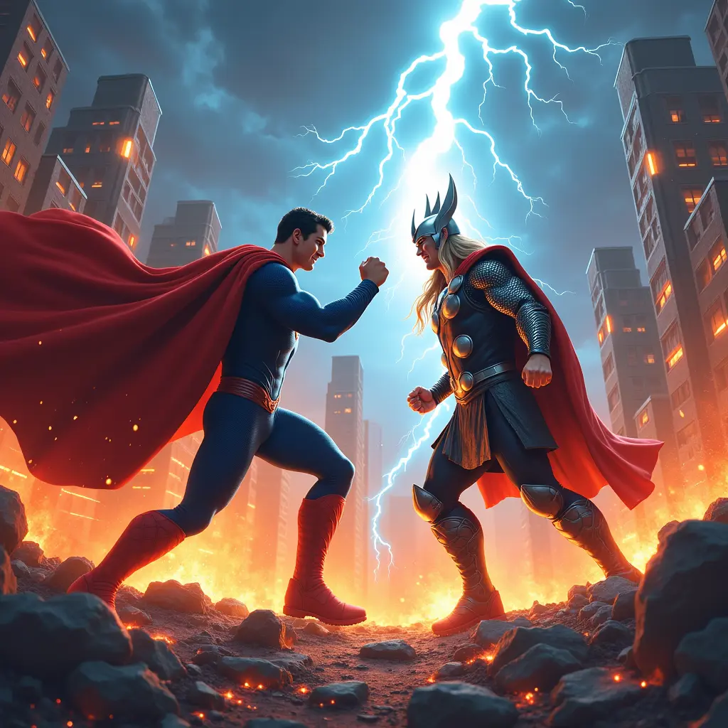 سوبر مان ضد ثور ملك الرعد في قتال علي كوكب الأرض مع وجود حمم بركانيه و عمارات محطمه مع وجود جيع الأبطال الخارقون يشاهدون