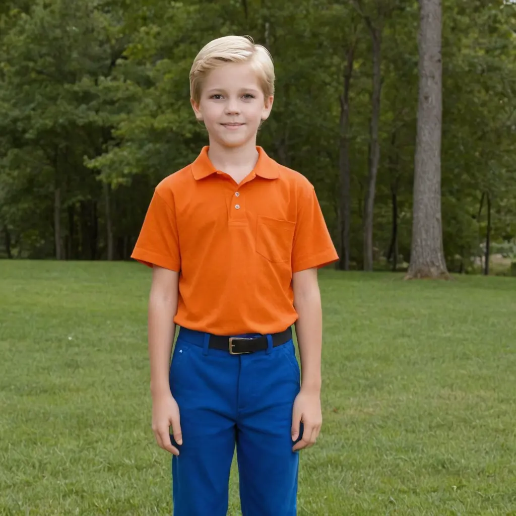 أريد صورة لولد أبيض عينه سوداء شعره أشقر  يرتدي قميصا برتقالي وسروال أزرق عمره تقريبا 8سنوات