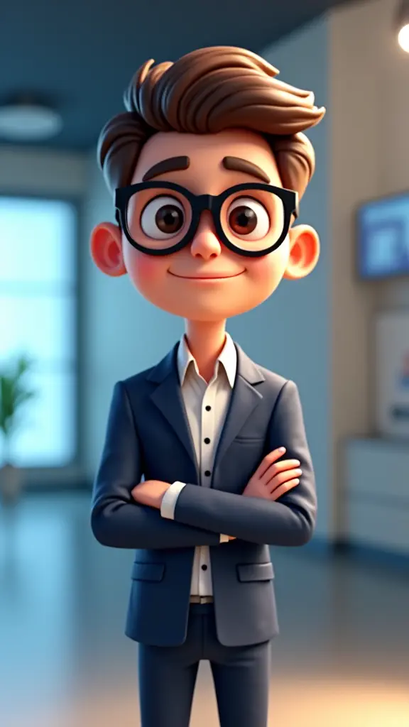 أريد إنشاء شخصية رمزية تمثل صناعة المحتوى وتسويق المحتوى تُستخدم في بداية مقاطع الفيديو التعليمية. يجب أن تكون الشخصية معبرة وعصرية، تعكس روح الابتكار والإبداع. الشخصية تظهر بثقة وحيوية، بملامح واضحة تعكس المهنية والود. ارتدِ ملابس أنيقة وعصرية تُعبر عن الاحتراف، ويمكن أن تتضمن عناصر تقنية (مثل نظارات حديثة أو إكسسوارات رقمية) تُبرز جانبها المتصل بالعالم الرقمي. يجب أن يكون تعبير وجهها ملهمًا ودافئًا، يبعث على الحماس والإبداع، مع ملامح تجمع بين الجدية والود. الشخصية تكون في وضعية واقفة بثقة، مع حركة بسيطة توحي بالتفكير والابتكار. الخلفية يمكن أن تكون مجردة أو تحتوي على عناصر خفيفة تشير إلى عالم التكنولوجيا والمحتوى، بحيث تتناسق مع لقطة البيرول والكلام الذي يظهر في بداية الفيديو.