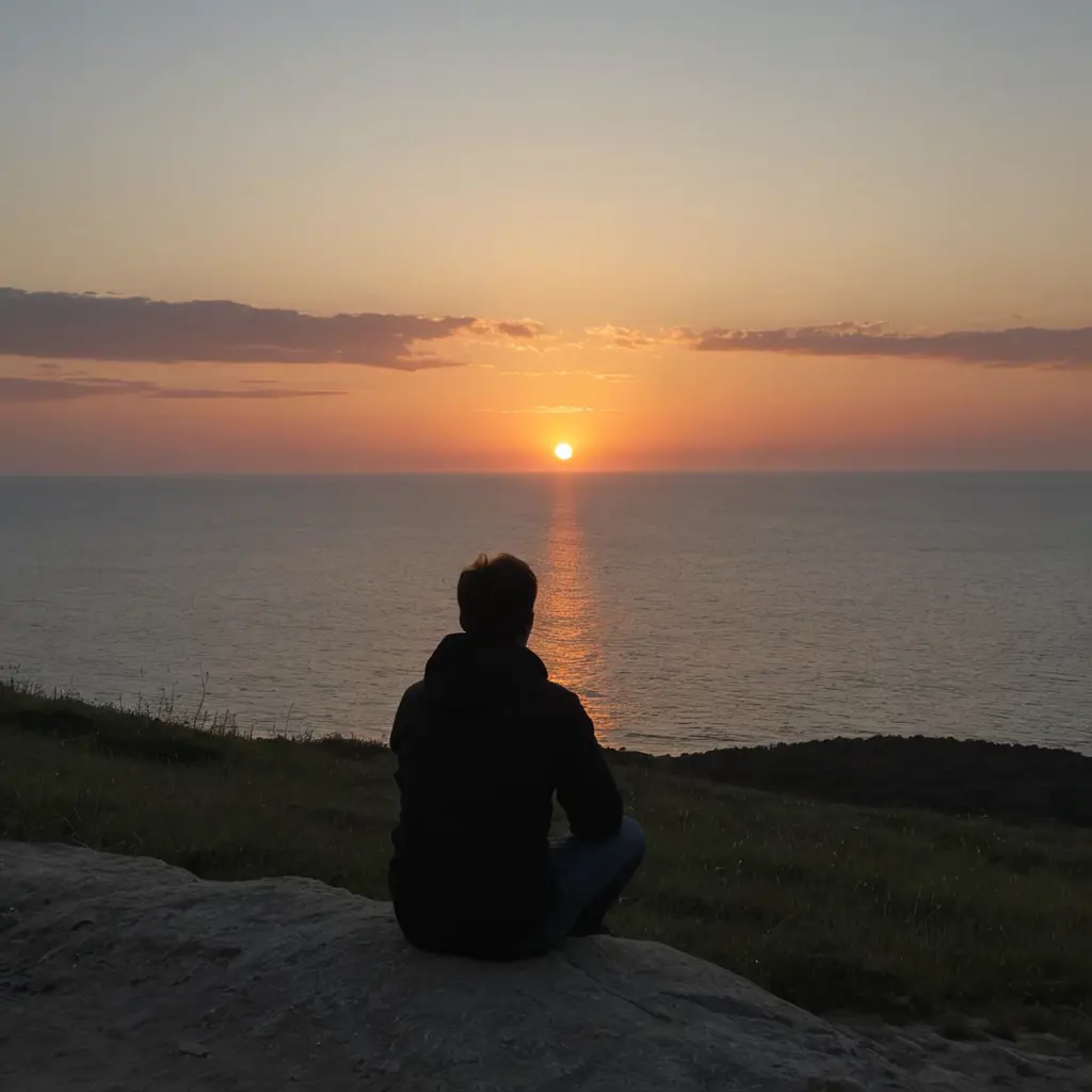 شخص حزين يشاهد غروب الشمس على البحر