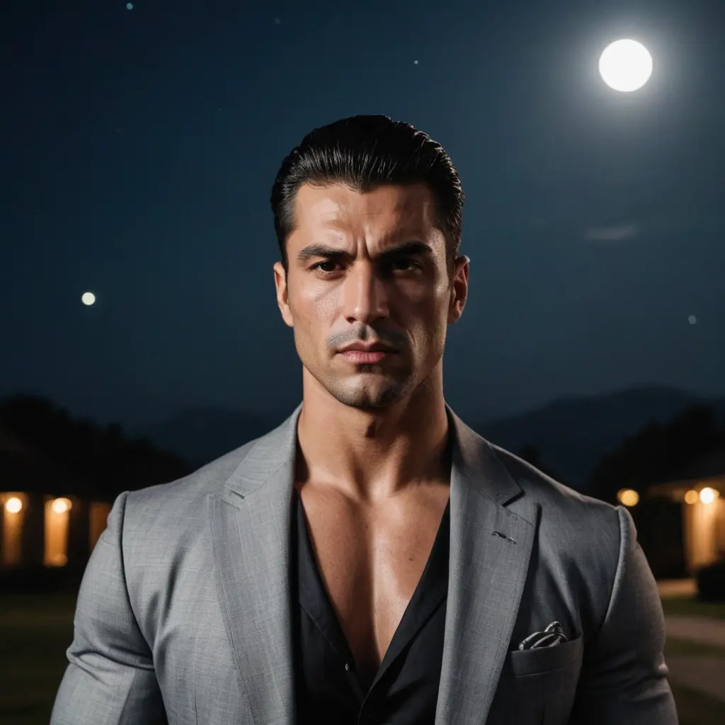 رجل زعيم المافيا معضل ووسيم ولديه جرح تحت عينه يقف تحت ضوء القمر مع عصابه