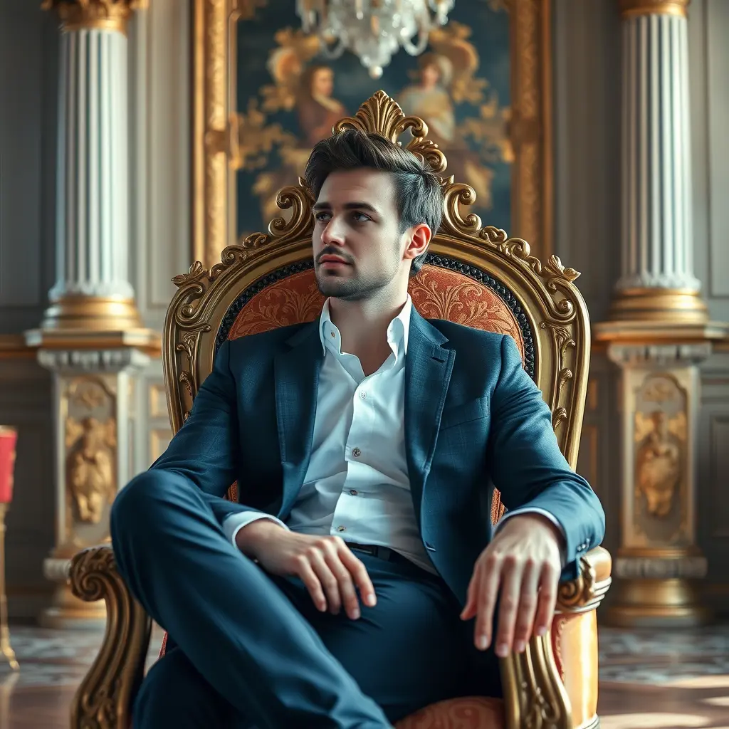 أريد صورة لشاب في عمر الثلاثين يكون طوله 160 ليس له لحيه أملس الوجه أو شارب يجلس على كرسي فخم داخل قصر حاطط رجله علي رجل وينظر بذكاء