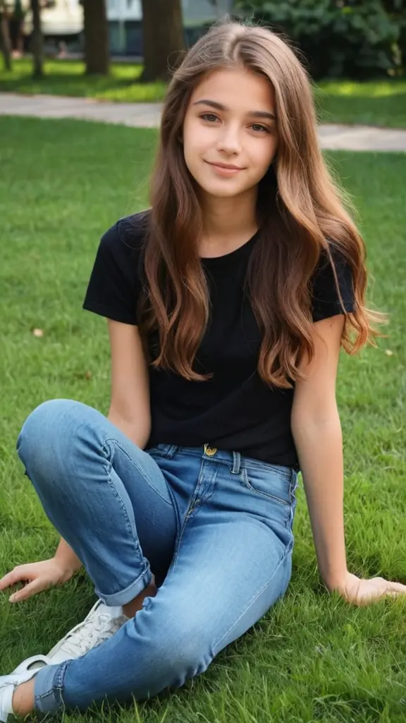 صوره لفتاه ونحيفه للغايه جميله جدا وبشرتها بيضاء وشعرها طويل وكثيف ترتدي ملابس جميله وعمرها13عاما تجلس على العشب في المنزل وترتدي تيشرت و اسود طويلل وشعرها مموج وناعم وجينز طويل وملامحها اجنبيه وعربيه وروسيه جذابه جدا
