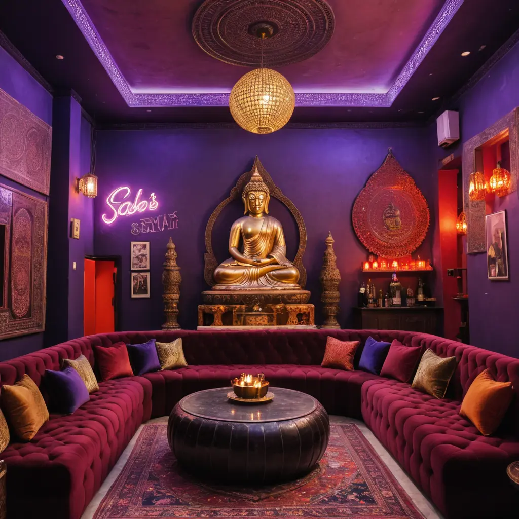 Bar restaurante ecléctico y bohemio, con muchos sofás de terciopelo de color morado y rojo intenso, pufs marroquíes, mesas redondas y luces de neón y un gran Buda de estatua con un gran cartel que diga como logo Sab's Home.