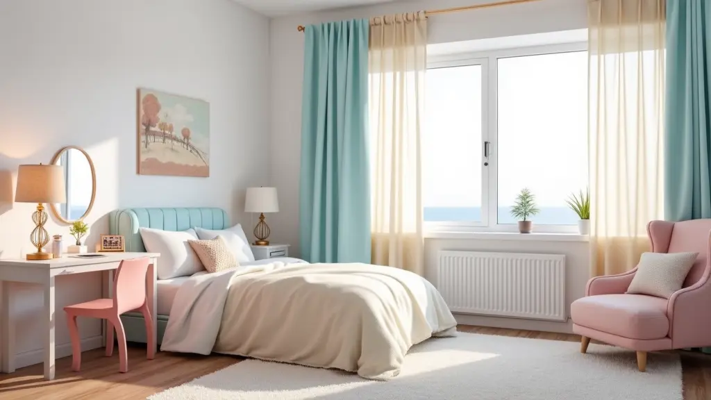 اتاق نوجوان، رنگ دیوارها سفید و صورتی روشن، پرده به رنگ آبی روشن و کرمی، تختخواب با روتختی کرمی و صورتی روشن، میز مطالعه به رنگ سفید و صورتی و آبی، صندلی بع رنگ صورتی روشن، یک عدد کاناپه، چراغ خواب ، میز آرایش با آینه دکوراتیو،تابلوی نقاشی روی دیوار