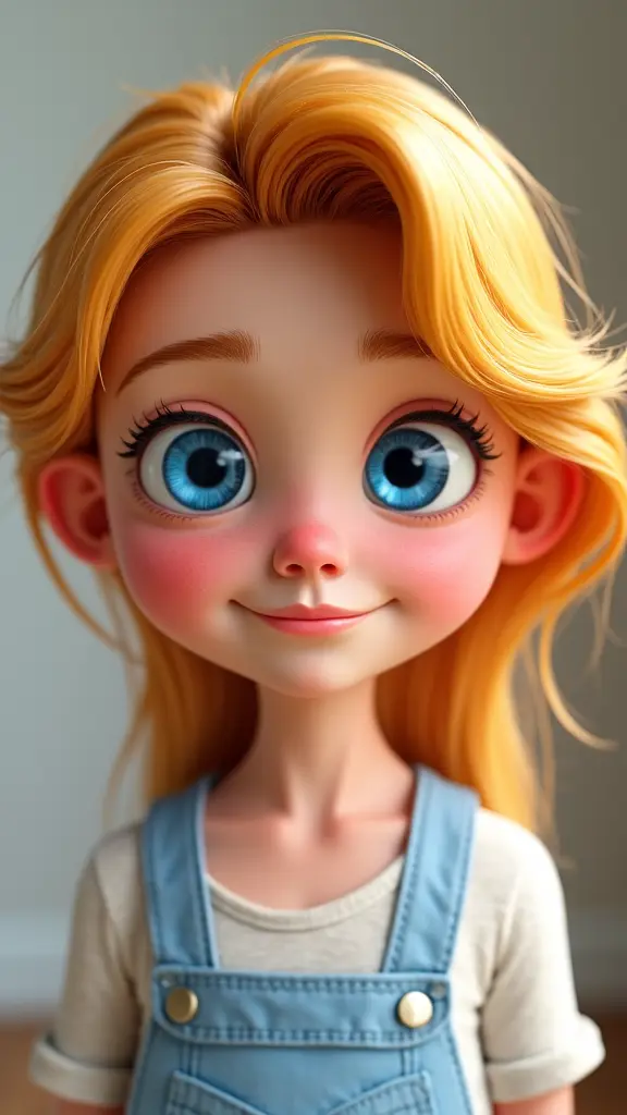 A girl with blue eyes, honey hair and white skin, in a Disney way 3d cartoon Disney She is 20 years old She has a yellow streak.