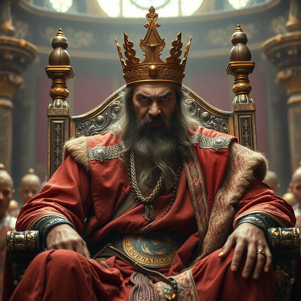 صورة لملك يجلس على عرش في قصره الملك يلبس لباسا تقليديا قديما ويظهر على وجهه الغضب الشديد والقوة