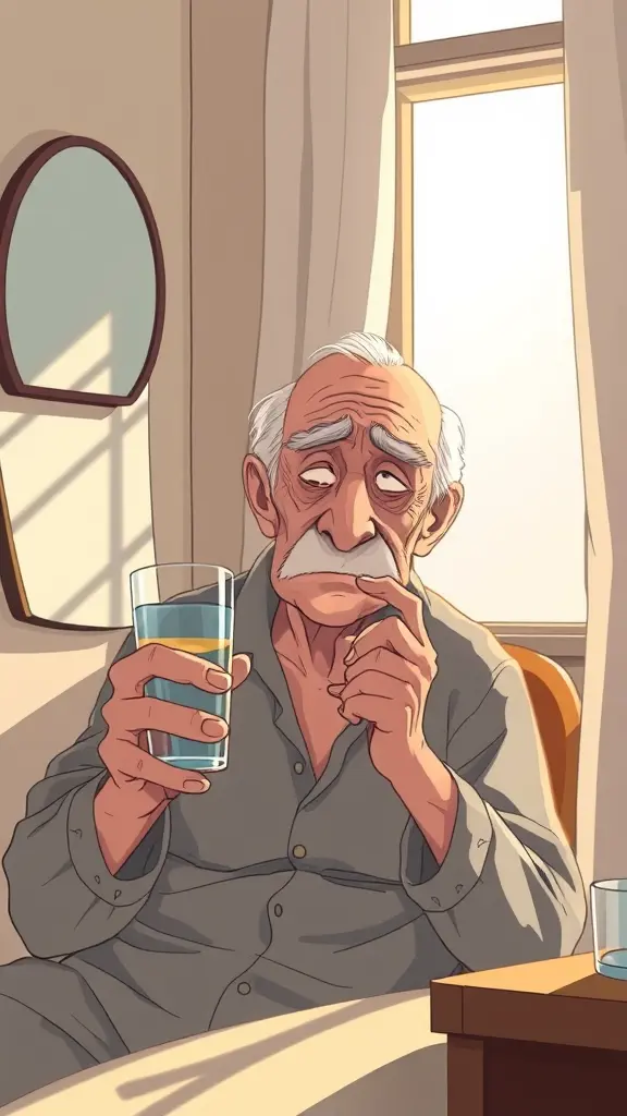رجل كبير في السن عليه تجاعيد على وجهه يداه ترتجفان وهو يمسك كوب الماء أخيرًا، لكنه لا يشرب.