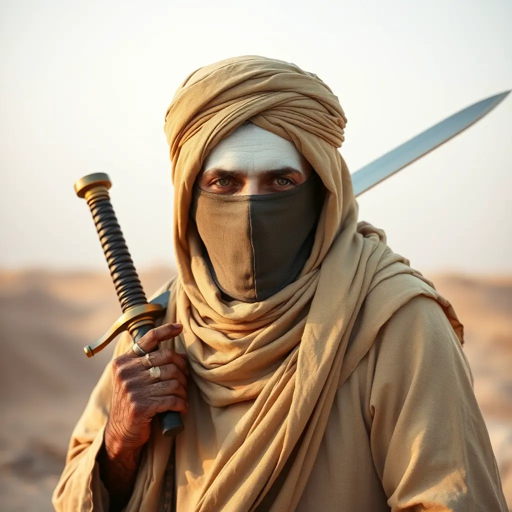 رجل من الطوارق يحمل سيف ولابس قماش ملثم حول رأسيه وابيض البشرة