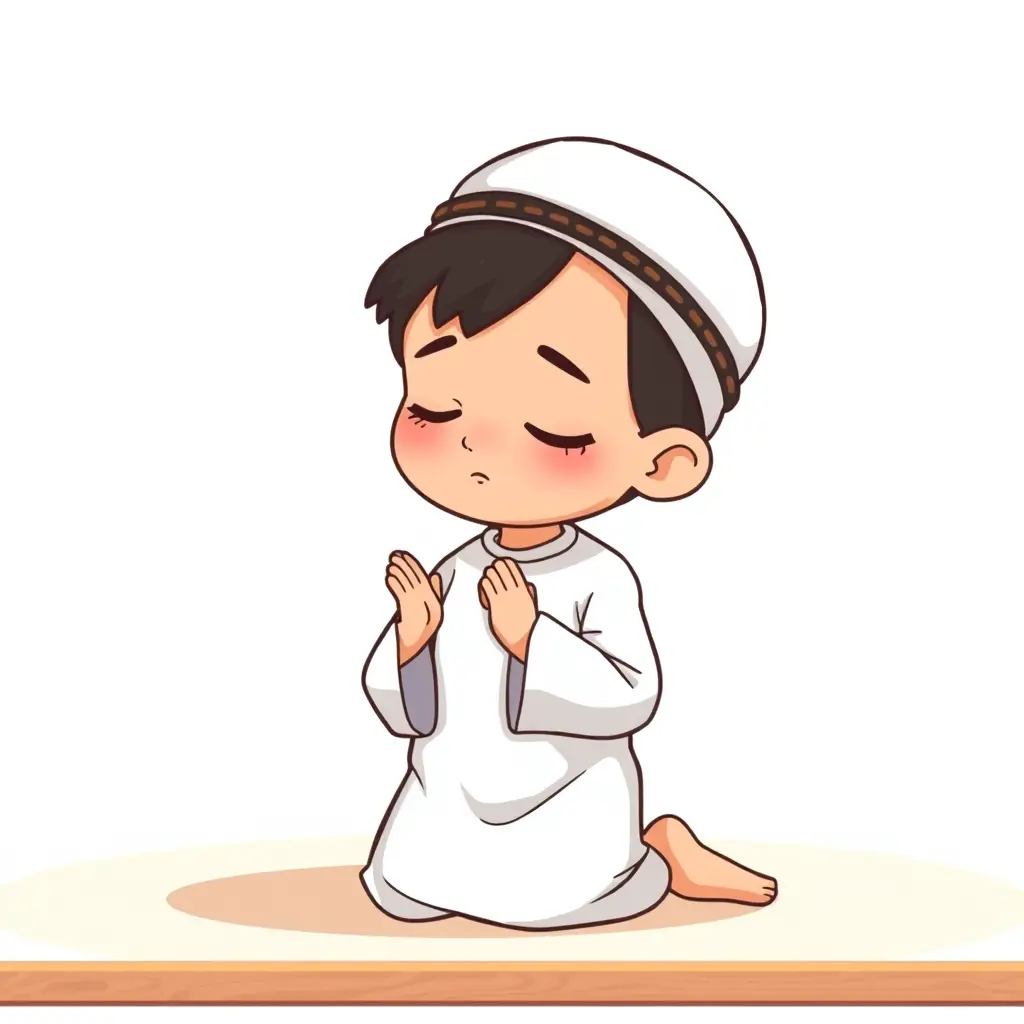 صورة كرتونية لصبي صغير يرتدي زيًا إسلاميًا تقليديًا، ثوبًا أبيض وقبعة كوفية بسيطة، راكعًا في الصلاة،