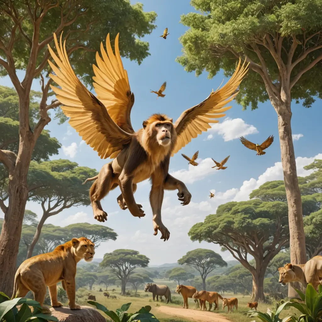 قرد يطير في الهواء بجناحه الذهبي وتحته الاسود والزرافة وفرس النهر واشجار