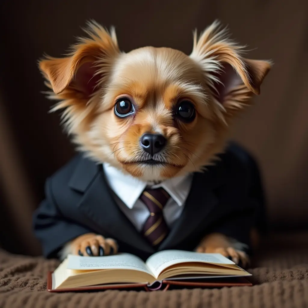صورة كلب صغير لابس بدلة رسمية وجالس يقرأ كتاب