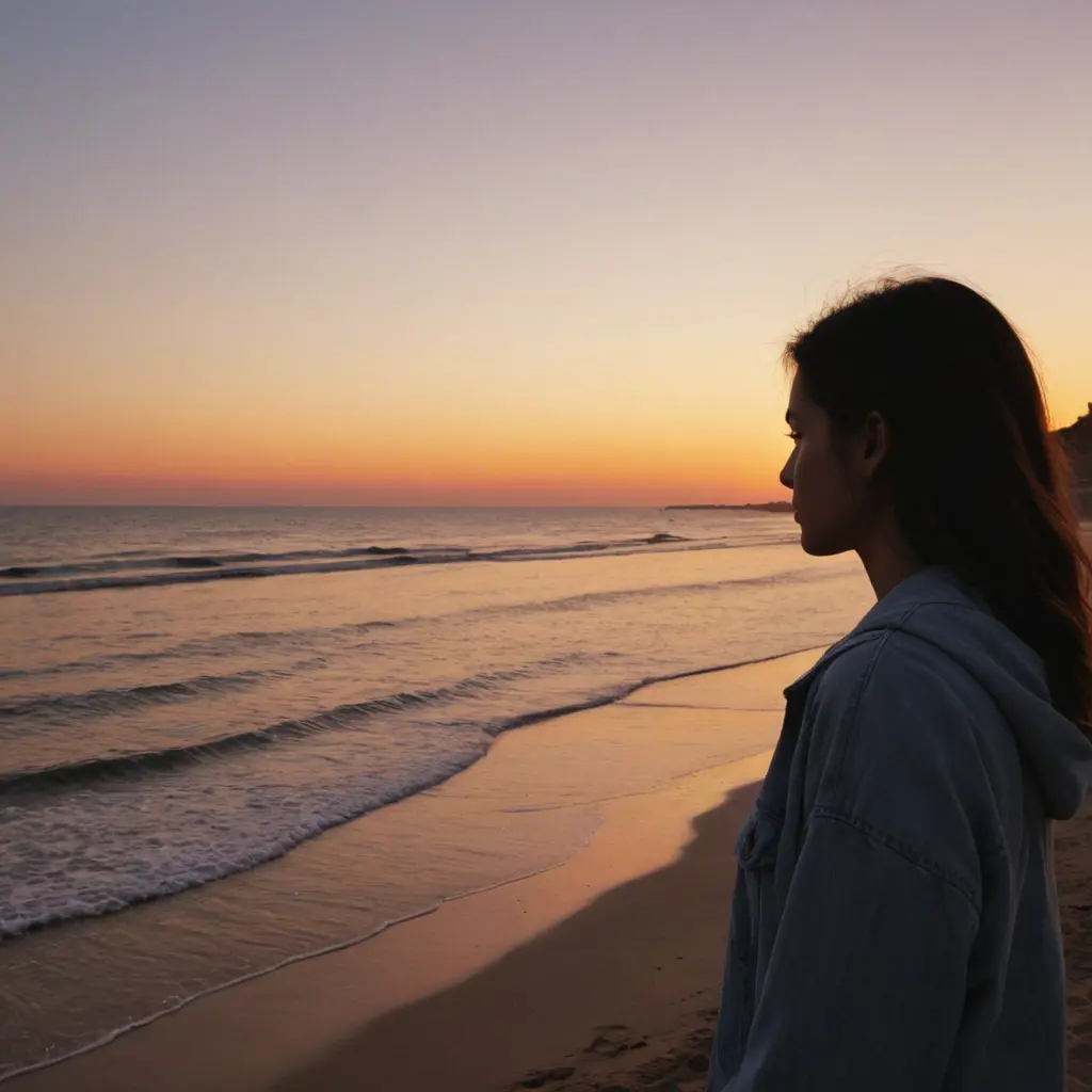 صورة شخص ينظر إلى شاطىء عند غروب الشمس