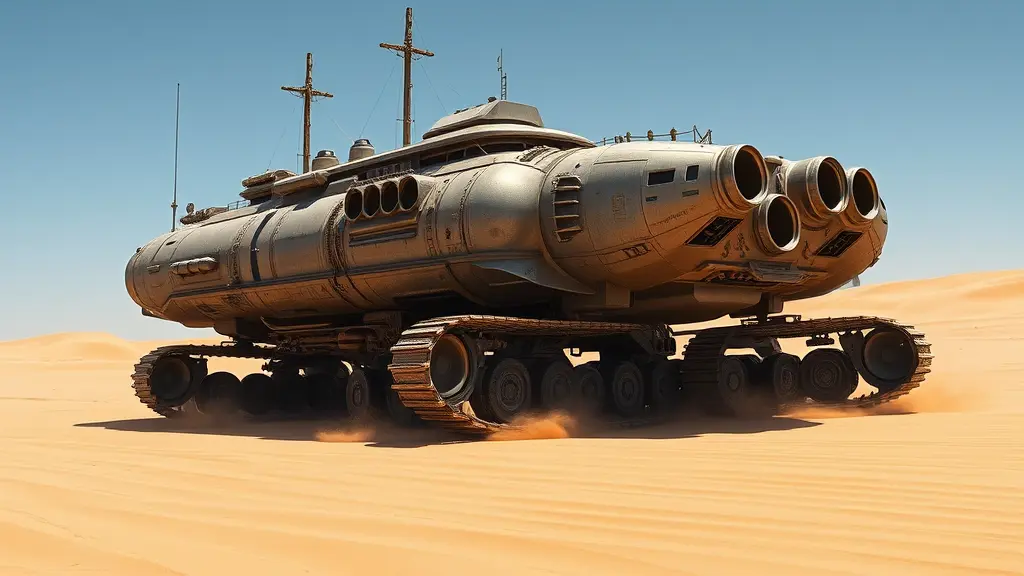 A massive, futuristic land ship crossing a vast desert under a clear blue sky. The ship moves not on water but on giant tank-like treads, covered in sand and dust. Its body is metallic, combining brushed steel and bronze textures, designed like a naval vessel with fake wooden beams and small metallic sails. The sides feature large ventilation grills and heat exhausts emitting faint steam and dust. The environment consists of smooth sand dunes and light sandstorms in the distance. Harsh sunlight creates strong shadows, emphasizing the ship’s massive treads and the sand disturbed beneath them. The scene conveys a sense of isolation and unstoppable power.