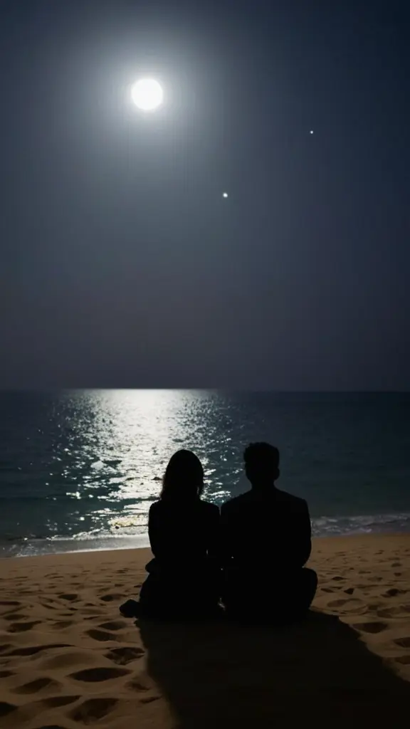 صورة من الخلف لرجل سعودي وحبيبته يجلسون على شاطيء البحر ليلاً والقمر مكتمل