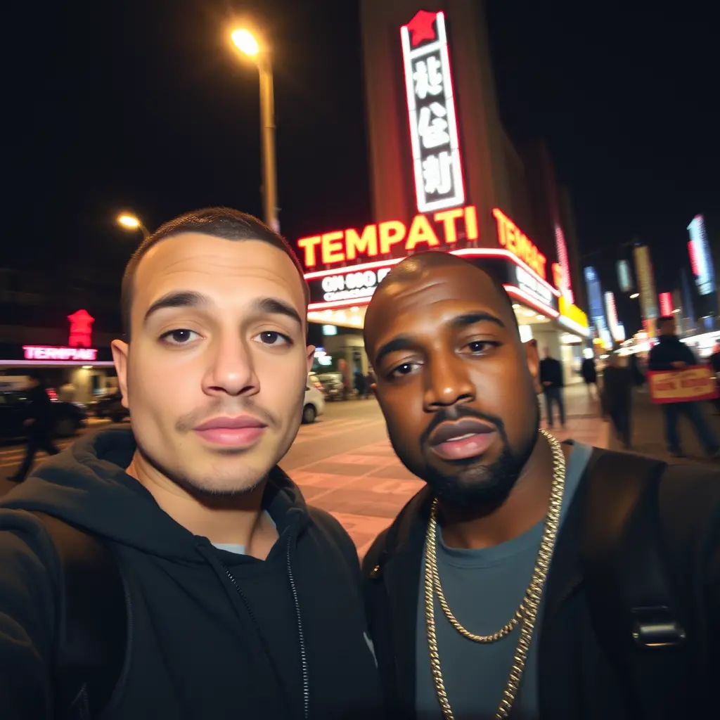 @🦧: Take an extremely ordinary and unremarkable iPhone selfie, with no clear subject or sense of composition—just a quick accidental snapshot. The photo has slight motion blur and uneven lighting from streetlights or indoor lamps, causing mild overexposure in some areas. The angle is awkward and the framing is messy, giving the picture a deliberately mediocre feel, as if it was taken absentmindedly while pulling the phone from a pocket. The main character is [uploaded person's face], and (kanye west) stands next to him, both caught in a casual, imperfect moment. The background shows a lively TEMPAT at night, with neon lights, traffic, and blurry figures passing by. The overall look is intentionally plain and random, capturing the authentic vibe of a poorly composed, spontaneous iPhone selfie