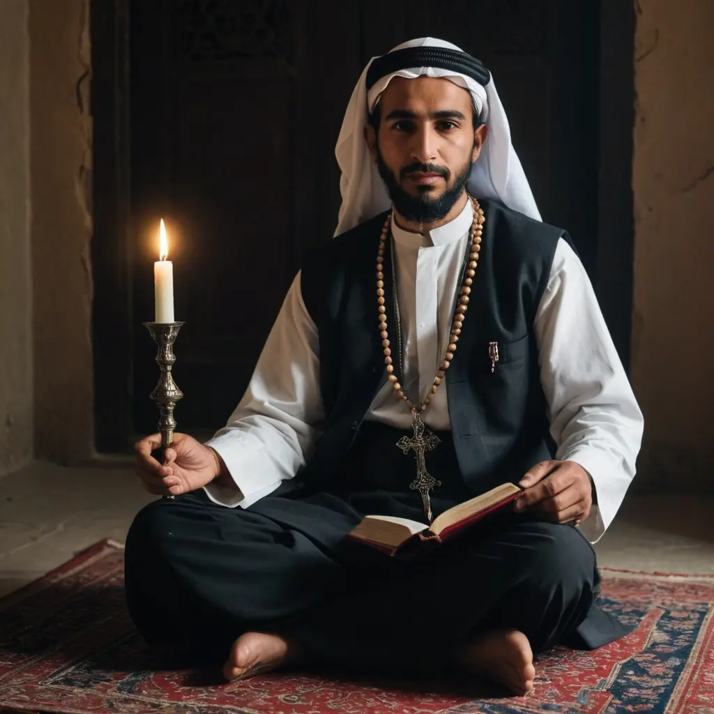 رجل يرتدي لباسا عربيا قديما في يده اليمنى مسبحة يجلس متربعا في غرفة شبه مظلمة وتوجود أمامه شمعة ونافذة ينبعث منها نور وأمامه مصحف