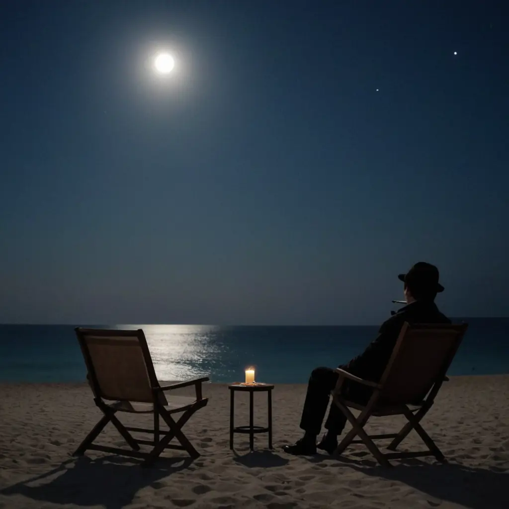 اعمل لي صوره واحد قاعد في الشتاء ع الشاطئ قدام بحر وجنبه كرسي فاضي وبيفتكر الذكريات وبيشرب سيجاره وضهره للصوره وفيه قمر خافت وهو قاعد علي كرسي والكرسي اللي جنبه فاضي والصوره تكون بليل