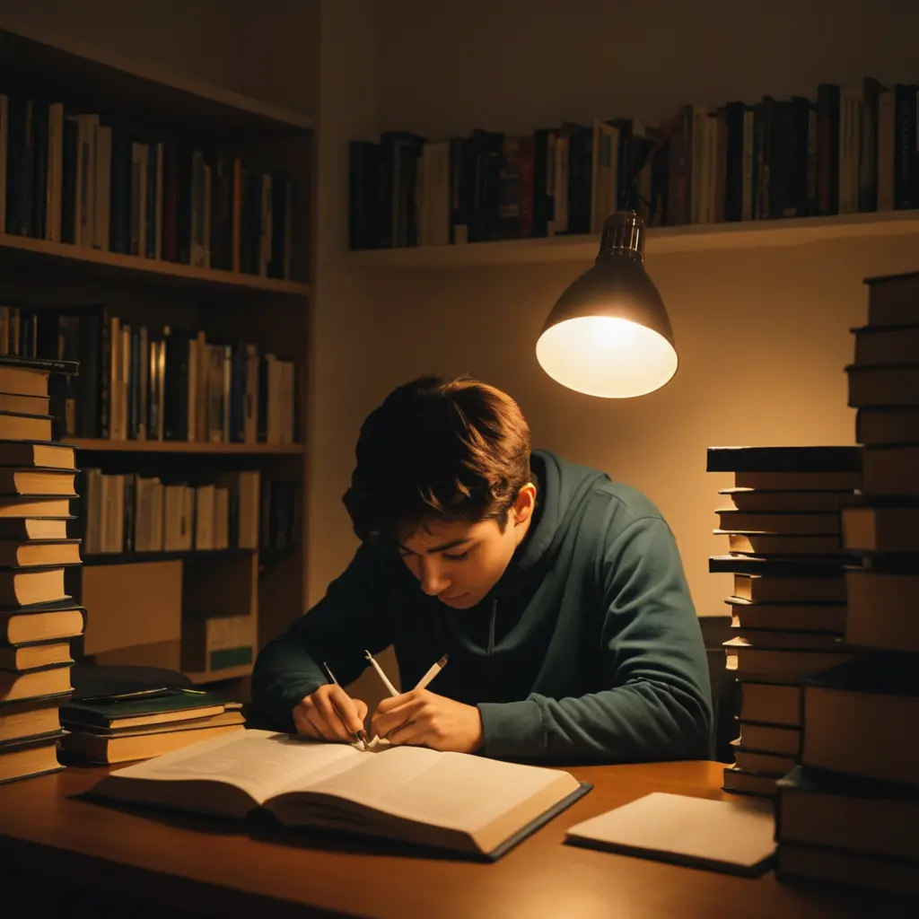 صورة طالب ولد يذاكر علي مكتب تحت ضوء المصباح وسط مجموعه من الكتب