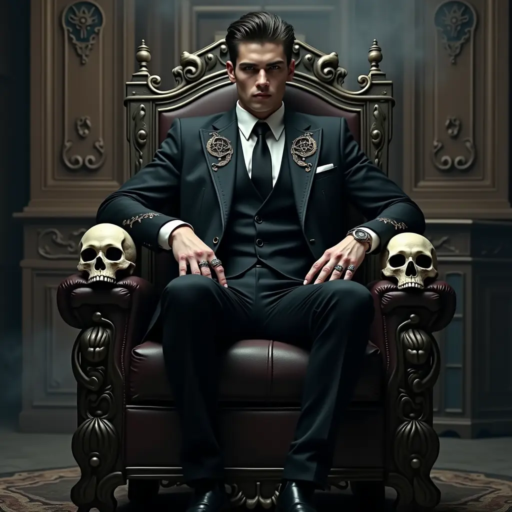 اصنع صورة ل شاب وسيم يمتلك جسد رياضي متناسق وله ملامح وجه حادة وعيون مخيفة يرتدي بدلة سوداء مطرزة ب طلاسم شيطانيه يجلس على عرش فخم بطرفيه جماجم هيكل عظمي والشاب يجلس بفخر ع العرش ويتكي بيده علي الجماجم ليظهر وجود خواتم مخيفة في أصابعه وحلي أكثر خوفا في معصمه وبجانب العرش سيف قوي جدا حاد من طرفيه مع وجود زينه لجدران الغرفة زينه شيطانية مخيفة جدا مع وجود اضاءه ليلية خافته ودخنه رمادية لتجعل المشهد اكثر رعبا