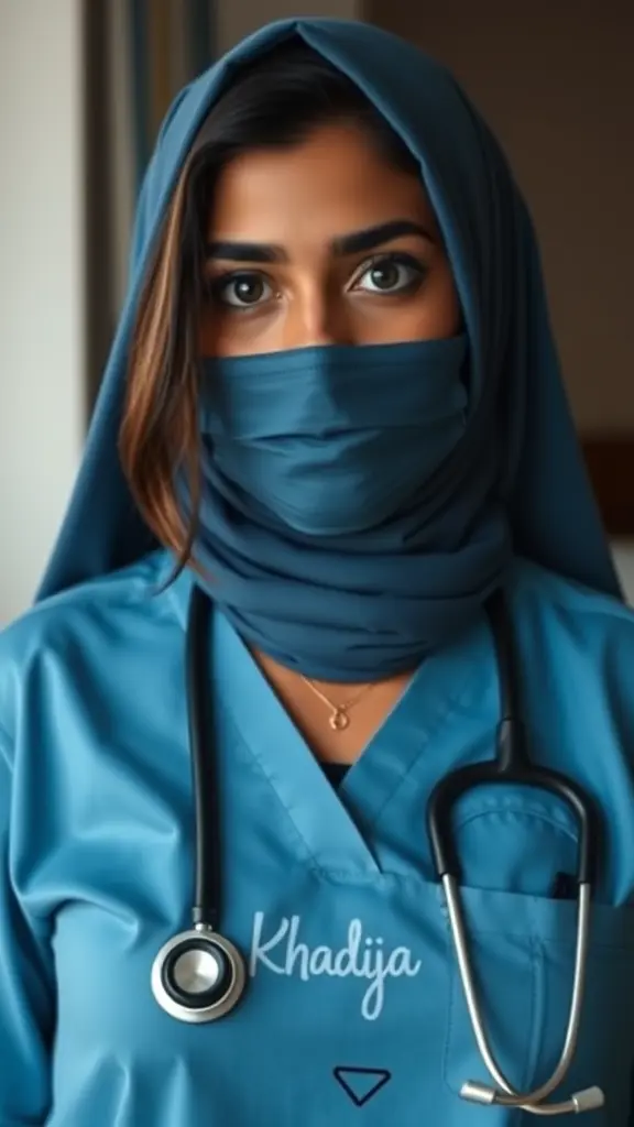 صورة ممرضة سمراء لبس الممرضات لونه ازرق غامض مكتوب عليه اسم خديجة على رقبتها سماعة دكتور في بيت ترعى زوجها مغطية شعرها بحجاب اسلامي وزنها 80 كيلو هي سوداء
