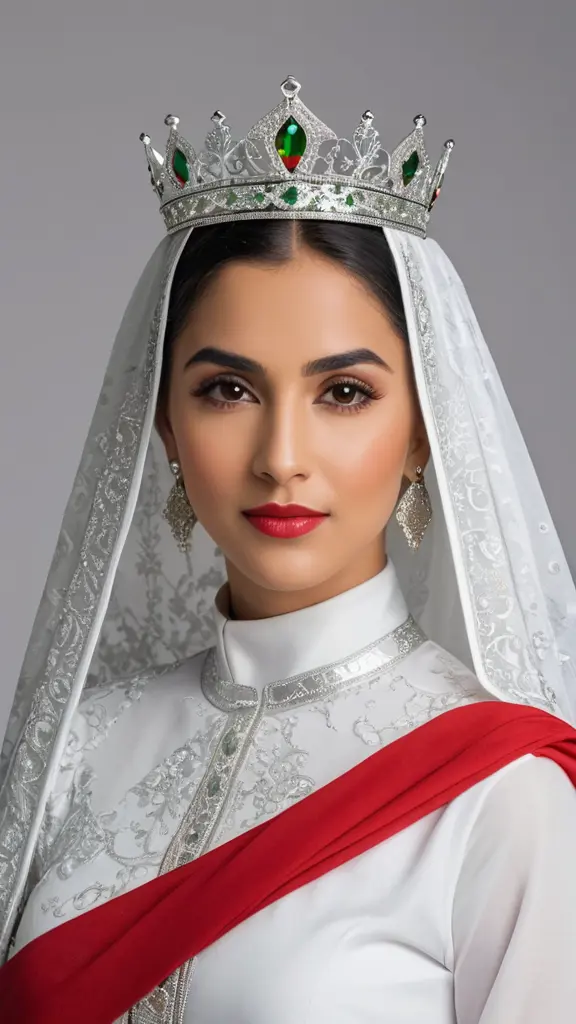 شعار يوم المرأة العمانية  بحجاب عليه تاج مصنوع من الفضة والأحمر والأخضر أنيق عصري لبس عماني