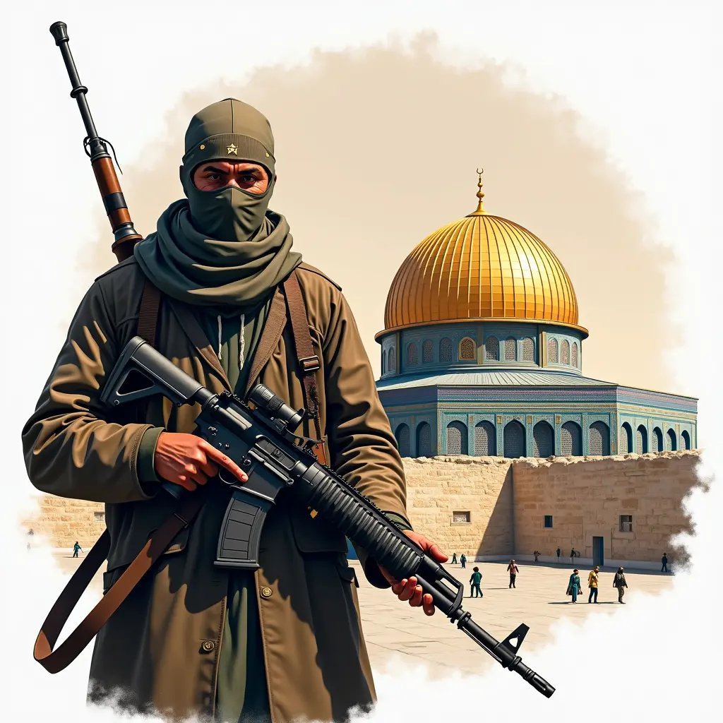 صورة شعار، رجل يحمل سلاح خلفه المسجد الاقصى، HD واضح، png, دقة التفاصيل