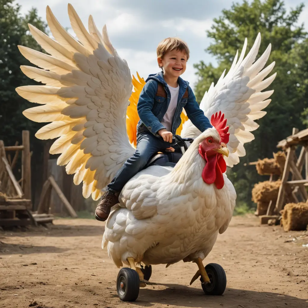 طفل يركب دجاجه عملاقه لها جنان