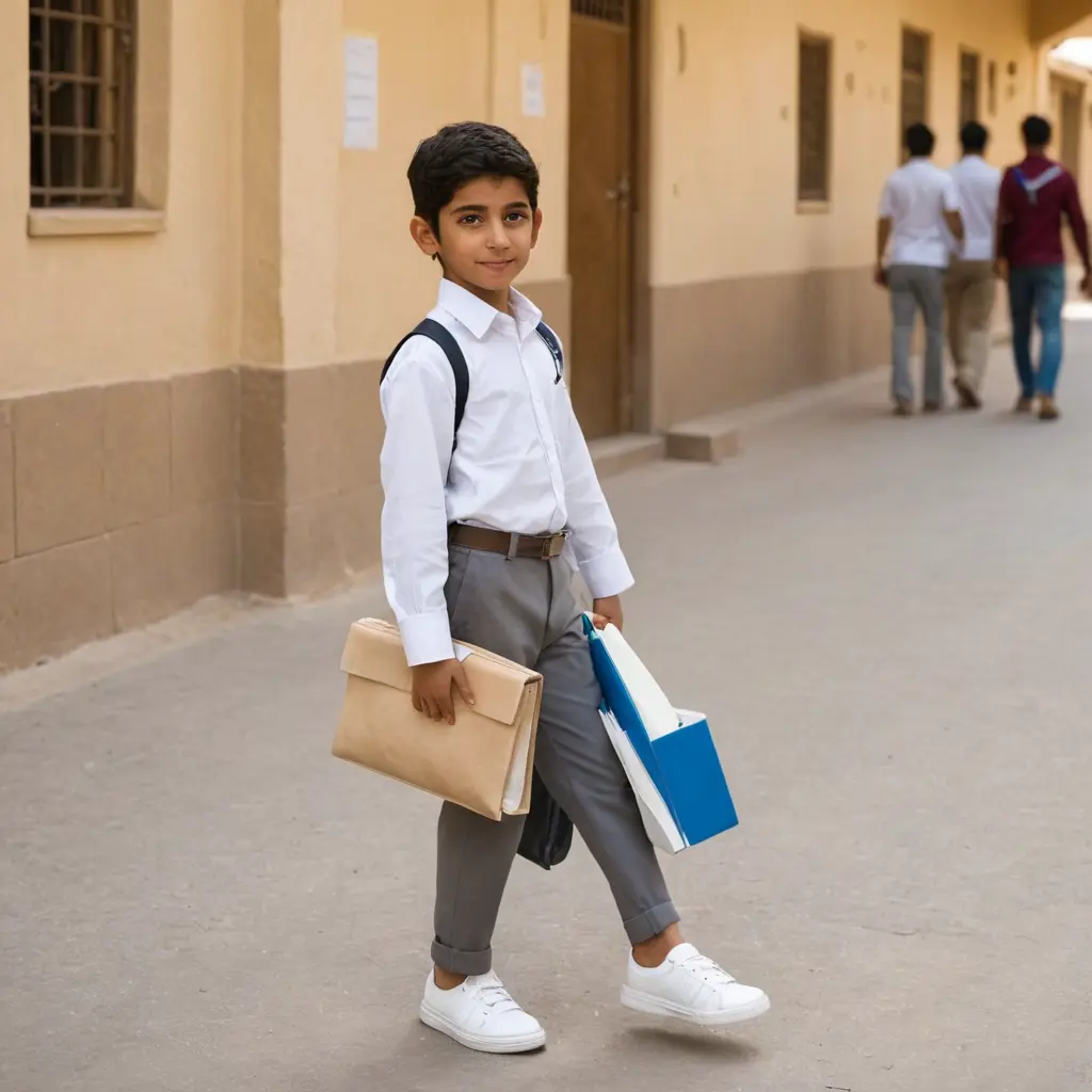 طفل سعودي يرتدي بنطال رمادي وقميص أبيض يحمل حقيبته وكتب دراسية