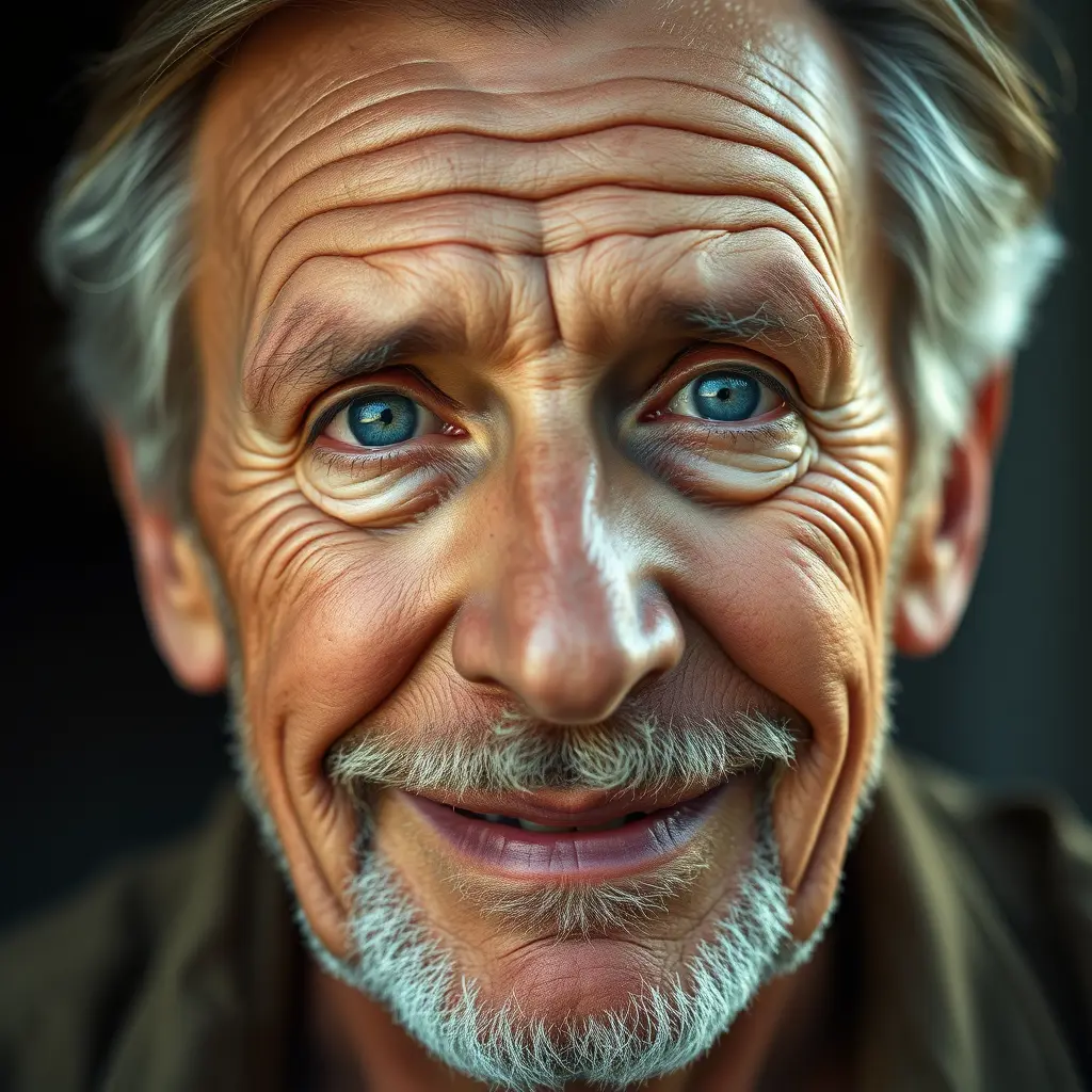 A portrait of a 60-year-old American wise man with a weathered face, deep wrinkles, kind blue eyes, warm smile, dramatic light,