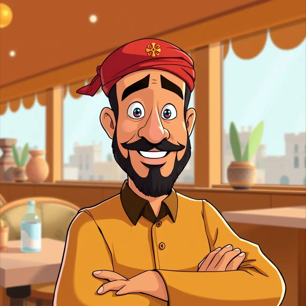 صورة كارتونية لشخصية ابو جنة صاحب مطعم مسكوف ابو جنة في الموصل على طريقة بيكسار